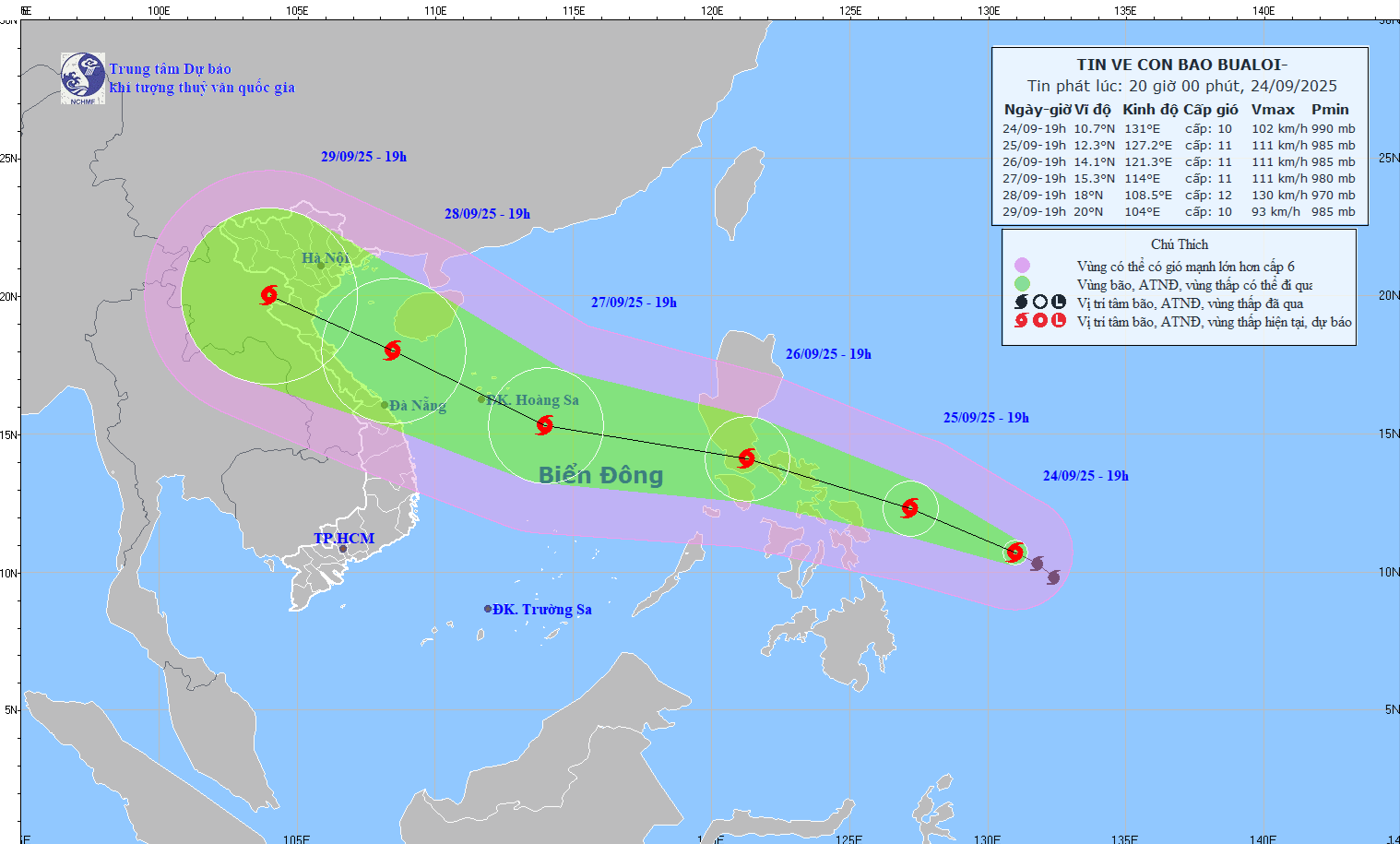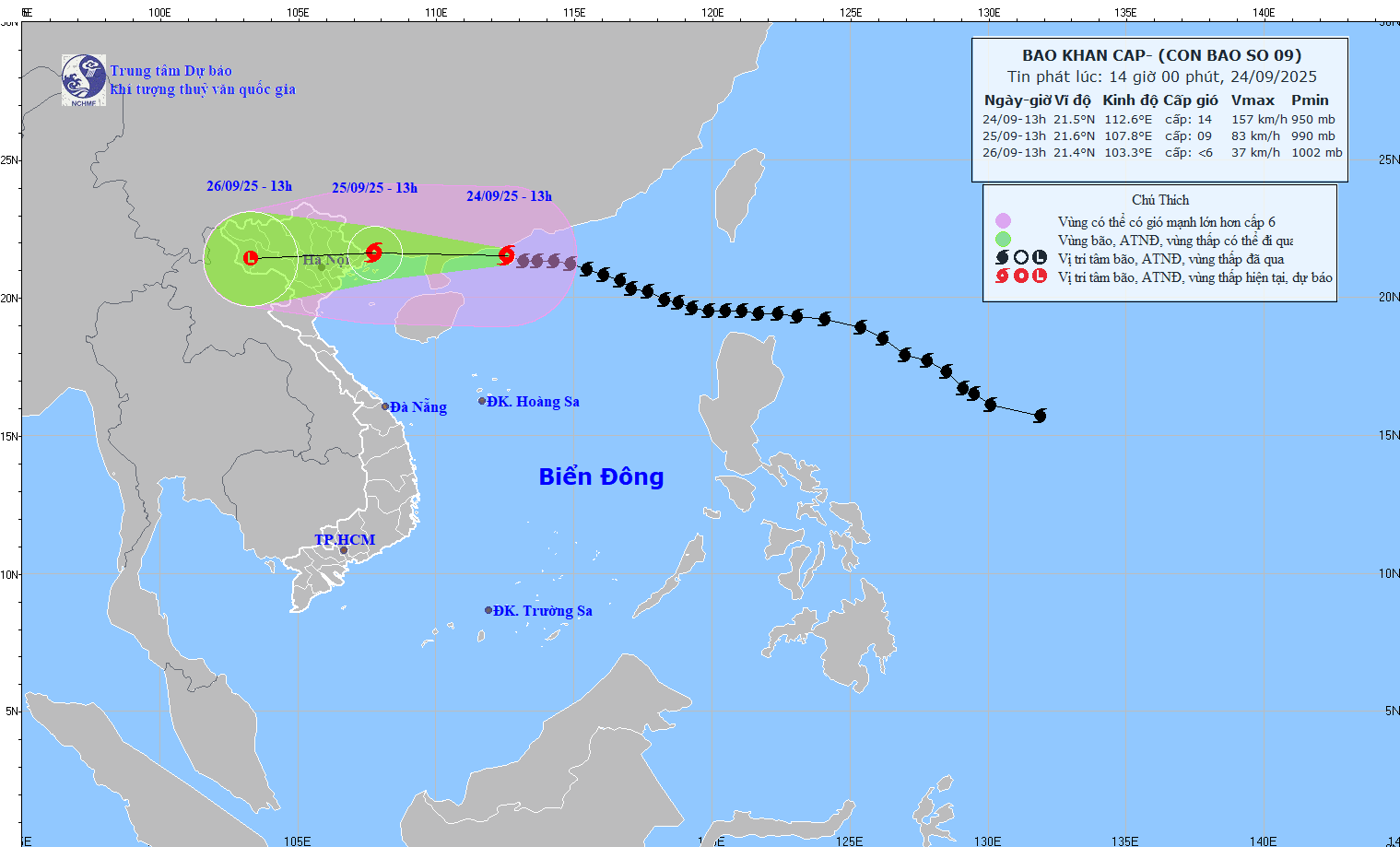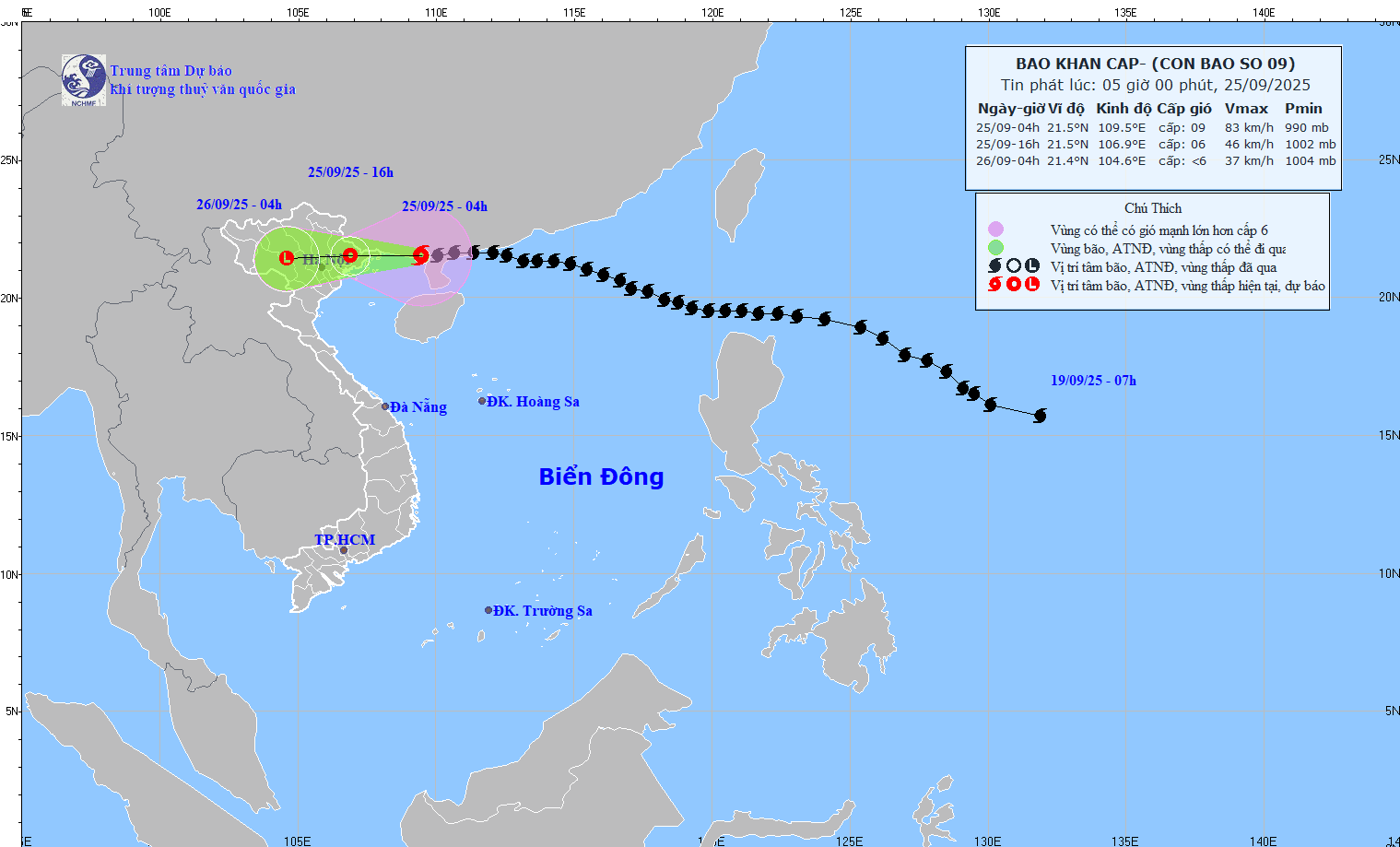 🔹 Hồi 04 giờ ngày 25/9, vị trí tâm bão ở vào khoảng 21,5 độ Vĩ Bắc; 109,5 độ Kinh Đông, cách Móng Cái (Quảng Ninh) khoảng 170km về phía Đông.